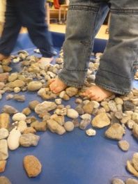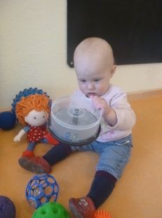 • Materialerfahrung: Anfassen von Wasser, Lebensmitteln, Spielzeug, Büchern, Sand, Gras, Steine, Knete, Fingerfarben etc. / erster Kontakt mit Löffel & Gabel, Schere, Klebstoff, Prickelnadel etc. / Musikinstrumente nutzen